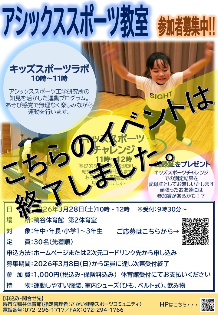 アシックススポーツ教室 ~キッズスポーツラボ・キッズスポーツチャレンジ~ 開催のお知らせ