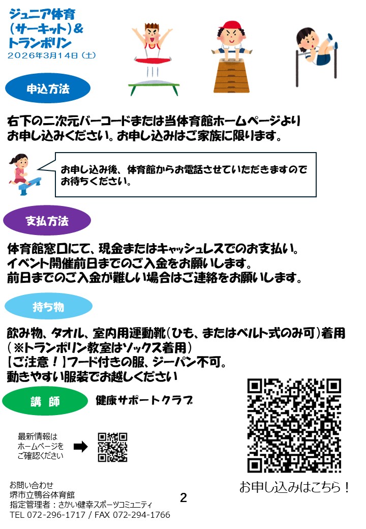 2026年3月14日(土)「ジュニア体育(サーキット)&トランポリン教室」の「幼児トランポリン教室」の開催時間に変更がございますので、お知らせさせていただきます。